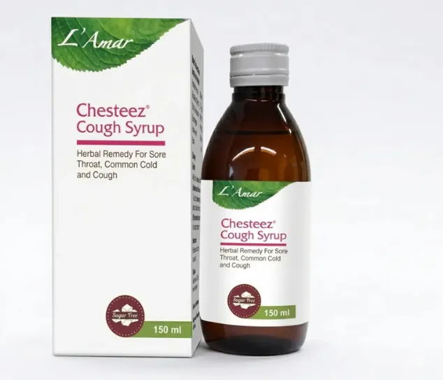 Chesteez Cough Syrup is a fast-acting herbal formula for cough and cold, proven effective by modern scientific research. Alcohol Free. Non Alcoholic, No Drowsiness, Non Sedative. Available in 42 countries for 20 years. Sugar Free variant also available. Dosage: Adults 2-3 tsp bid or tid; Children 1-2 tsp bid or tid or as directed by physician. Marketed by KAYAN Medicines & Medical Equipment Store LLC, Sharjah, UAE.