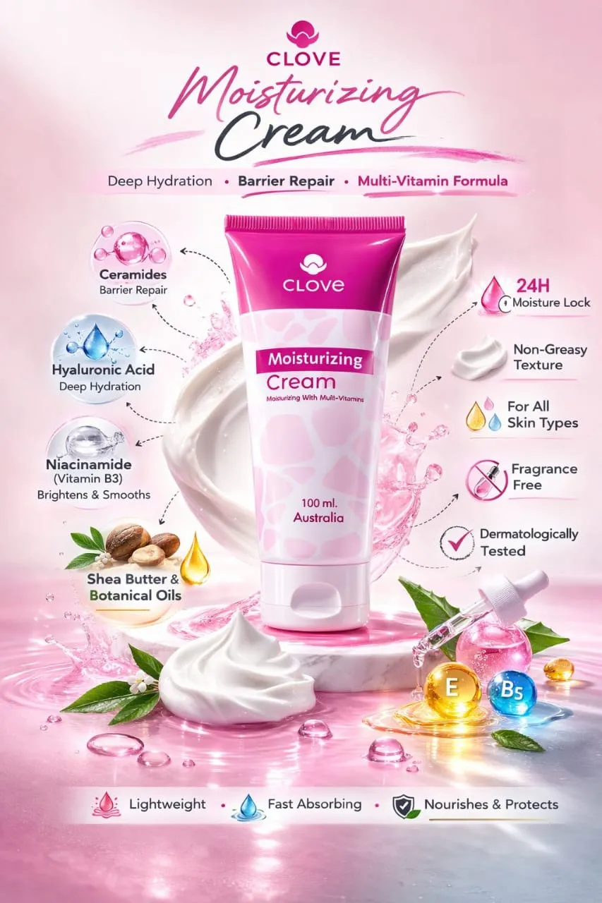 Clove Moisturizing Cream (100ml) offers deep hydration, barrier repair and a multi-vitamin formula for all skin types. Ceramides repair the skin barrier. Hyaluronic Acid provides deep hydration. Niacinamide (Vitamin B3) brightens. Shea Butter and Botanical Oils nourish and protect. 24H Moisture Lock. Non-Greasy Texture. Fragrance Free. Lightweight. Fast Absorbing. Nourishes & Protects. Dermatologically Tested. 100ml. Made in Australia.