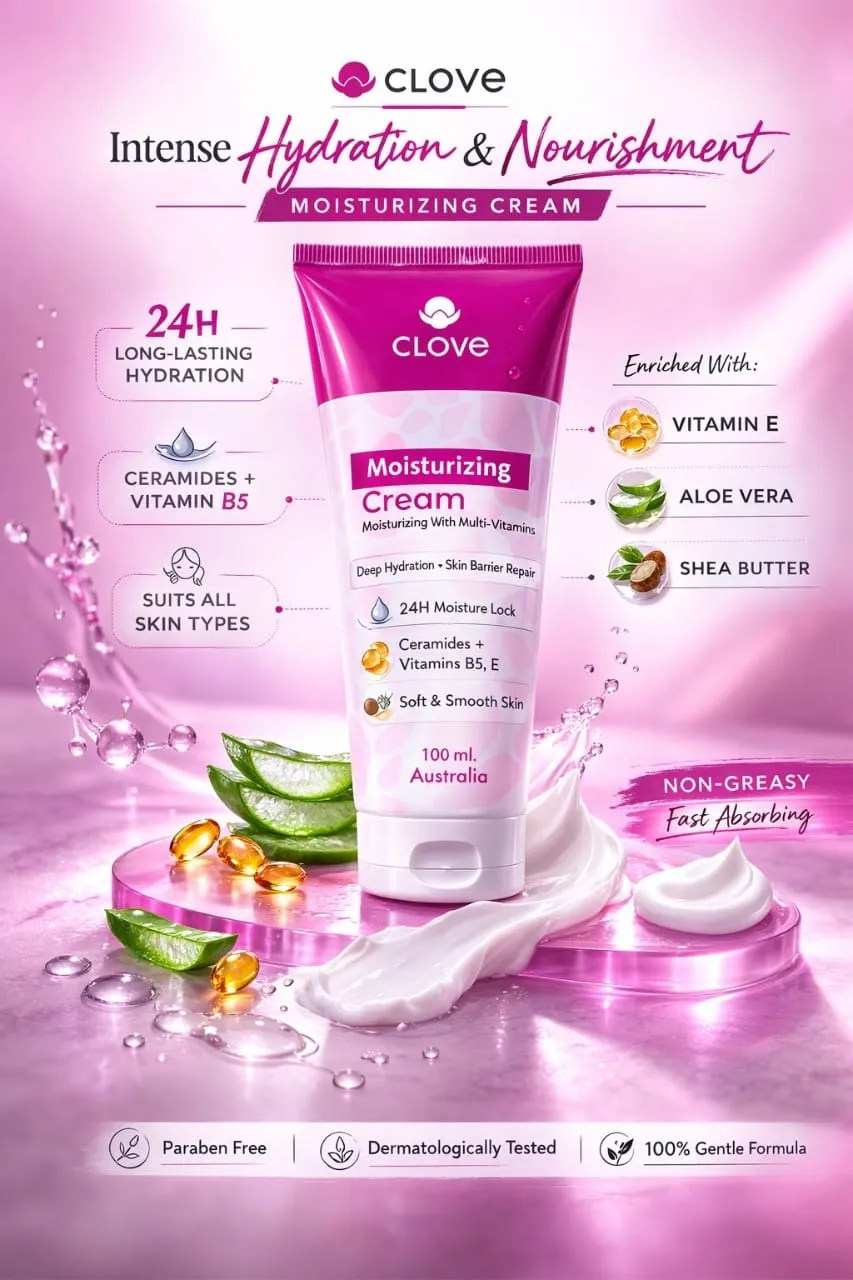 Clove Moisturizing Cream (100ml) delivers intense hydration and nourishment with 24-hour long-lasting moisture. Ceramides and Vitamin B5 strengthen skin. Vitamin E provides antioxidant support. Aloe Vera soothes. Shea Butter deeply nourishes. Suits All Skin Types. Non-Greasy. Fast Absorbing. Paraben Free. Dermatologically Tested. 100% Gentle Formula. 100ml. Made in Australia.