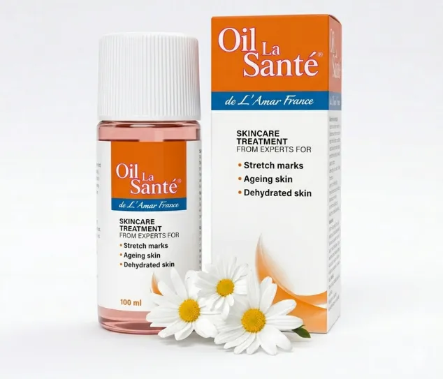 Oil La Santé de L’Amar France – Floral power for flawless skin. French Technology with I.M.C.E. (Isopropyl myristate + Cetearyl ethylhexanoate). Penetrates skin faster and takes active ingredients deeper. Helps improve: Dehydrated Skin, Scars, Mottled Skin, Ageing Skin, Stretchmarks and Uneven Skin. Hypo-allergenic, Non comedogenic, Suitable for all skin types including face and body. Apply few drops morning and evening. Use for at least 3 months for best results in scar lightening and stretchmarks. Celebrated in 35 countries. Marketed by KAYAN Medicines & Medical Equipment Store LLC, Sharjah, UAE.
